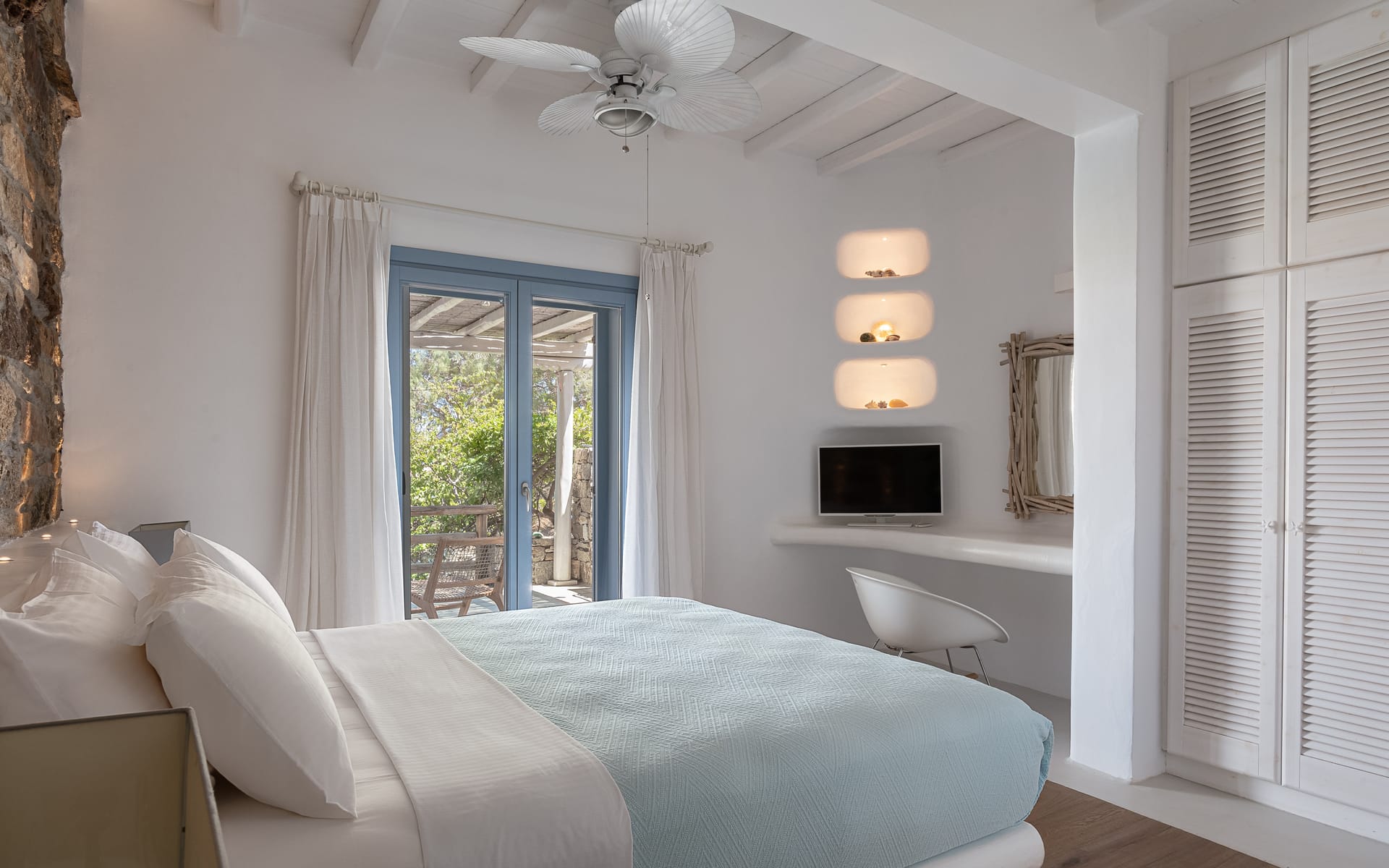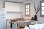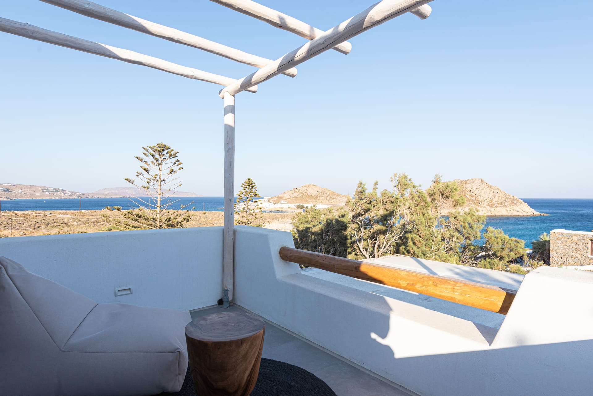 For couples or solo travelers, the Saint Anna Bungalow Mykonos offers a more intimate yet equally luxurious experience. This charming one-bedroom bungalow features a private balcony with uninterrupted sea views, providing an ideal spot to unwind and soak in the natural beauty of the area. The bungalow is equipped with a modern kitchen, allowing for a self-catered stay in a peaceful, cozy environment.