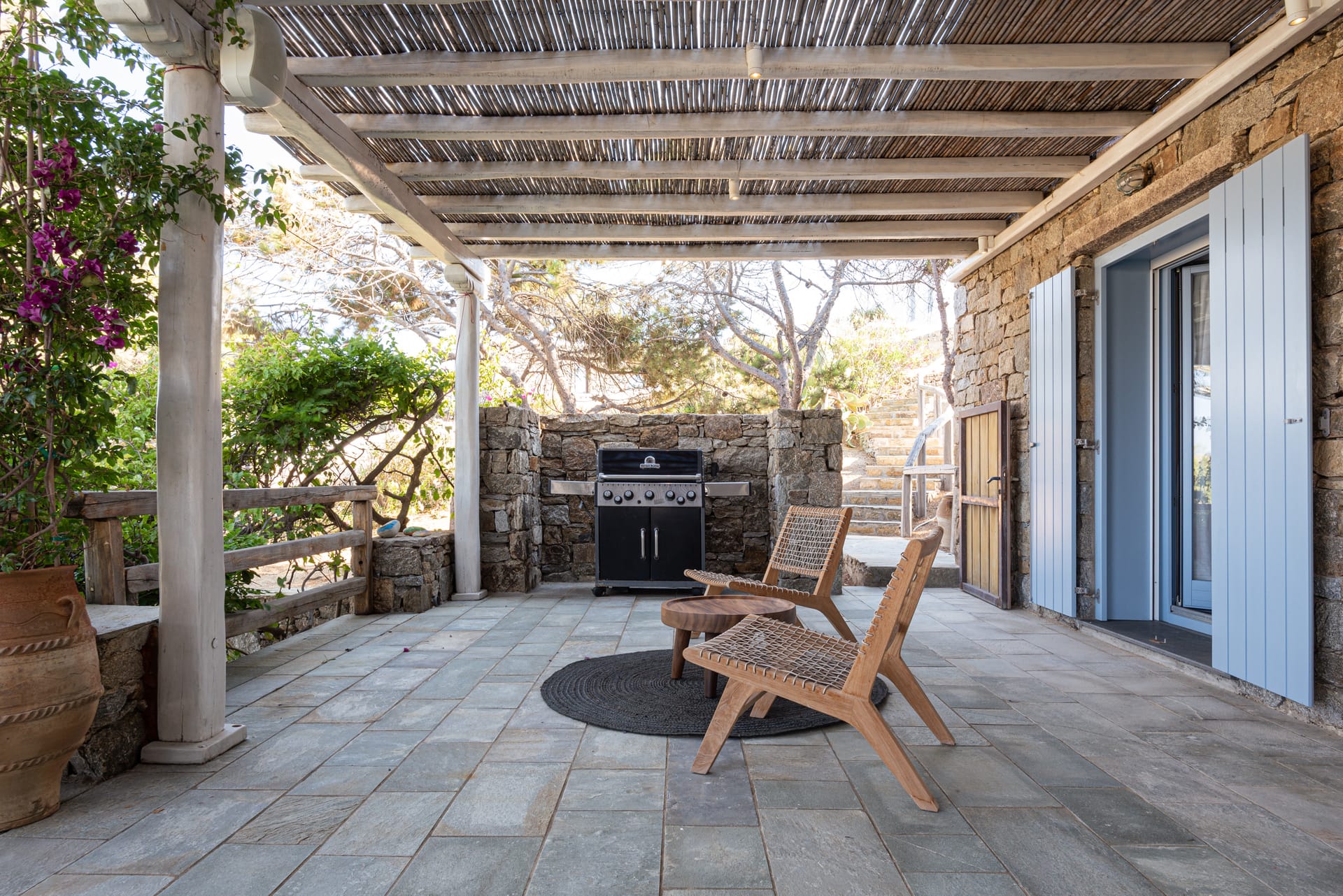 The Saint Anna Villa Mykonos is an elegant three-bedroom property, ideal for families or groups of friends. It boasts a spacious interior with modern furnishings, a full kitchen equipped with everything you need to prepare delicious meals, and BBQ facilities for outdoor dining. The villa opens up to a large balcony overlooking the sparkling Aegean Sea, creating the perfect setting for a morning coffee or sunset drinks. Guests can also enjoy the villa’s shared pool, where you can relax under the Mykonos sun while taking in the mesmerizing views.